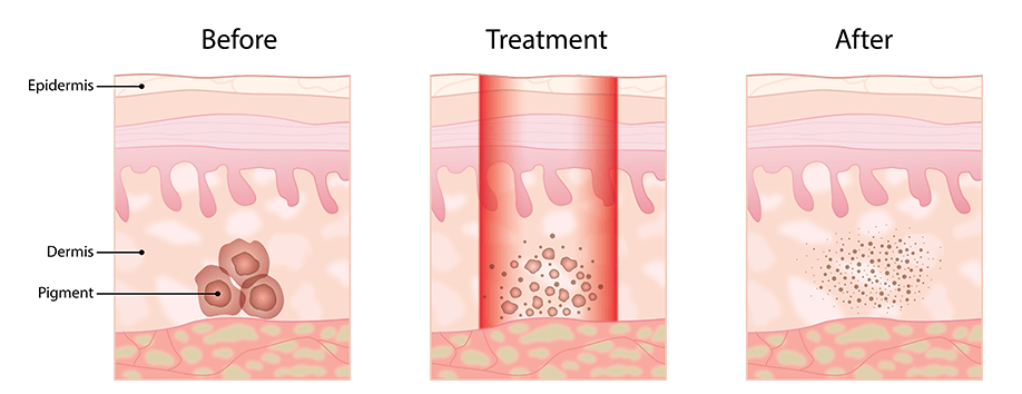 - Bước sóng 532nm tác động vào lớp nông hơn và lấy đi các sắc tố sậm màu trên da, được các thực bào hấp thụ và đào thải theo con cơ chế tự nhiên của cơ thể.