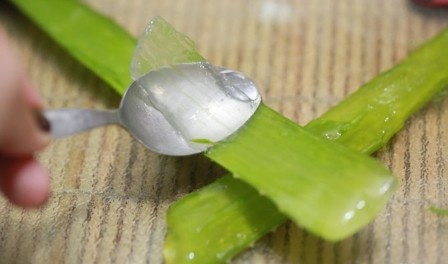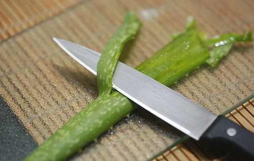 – Bước 1 : Bạn gọt hết phần vỏ xanh bên ngoài của nha đam và lấy phần thịt trắng ở bên trong
